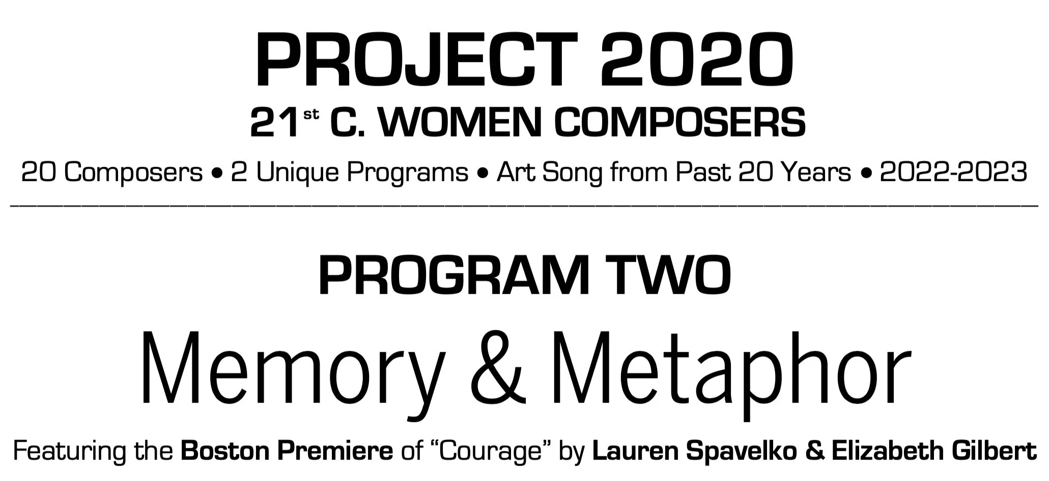 Featuring eight new 21st C. Women composers, Program Two | Memory & Metaphor offers an inviting and evocative look at story-telling through the expressive genre of art song. Filled with sense-memory textures in the piano, poetry and vocal writing, these songs offer musical snapshots ranging from intimate to inspiring to ironic. This program will also include the Boston Premiere of Lauren Spavelko’s song “Courage” with text by author Elizabeth Gilbert from her book Big Magic. The composer/performer team of composer Lauren Spavelko, soprano Jennifer Sgroe and pianist Eric Sedgwick, developed and performed the World Premiere of “Courage” in the Sparks & Wiry Cries 2023 songSLAM competition this past January 2023 in NYC and won 3rd Place in the Live and Virtual Audience Voting.